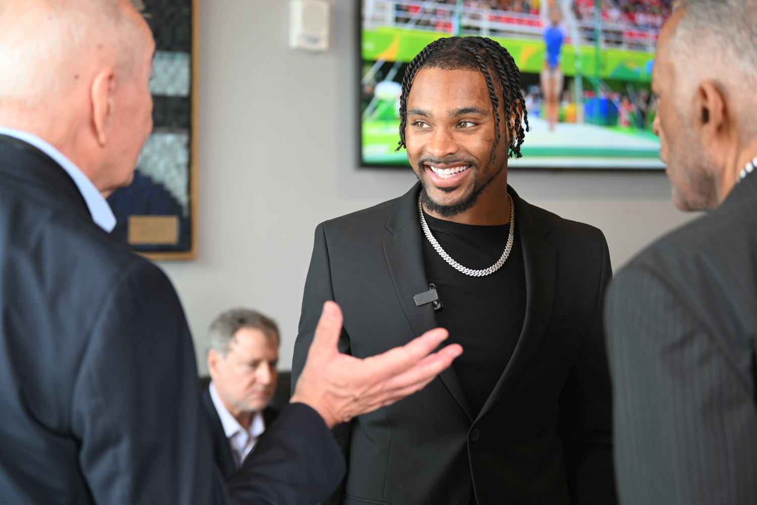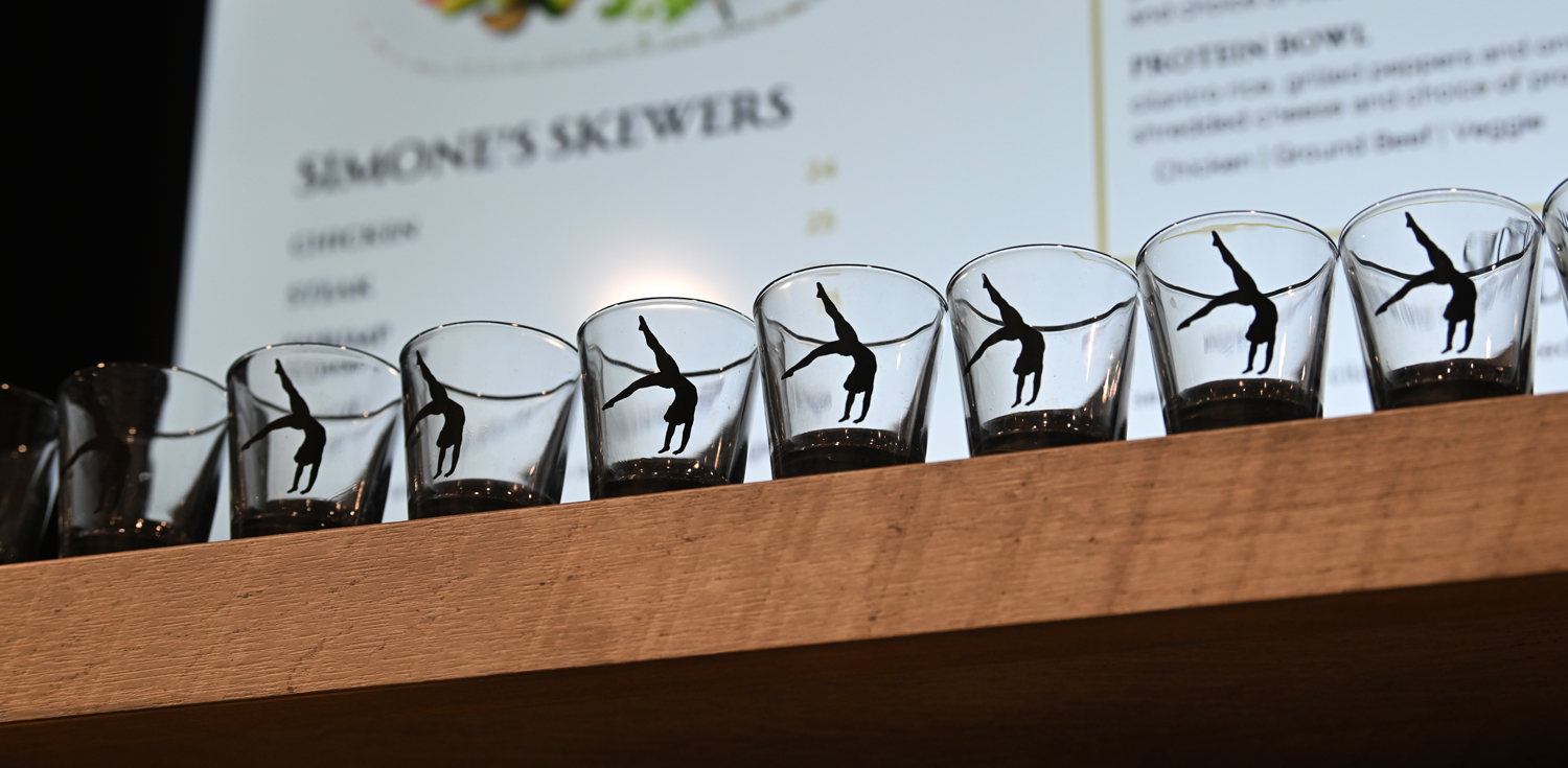 The facility provides multiple televisions around its bar for watching sporting events. It also features original 3D art by Texas designer Jody Dodson, including hand-crafted and painted wood, with gold embellishments accenting Biles’s leotard.
